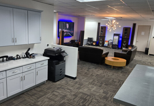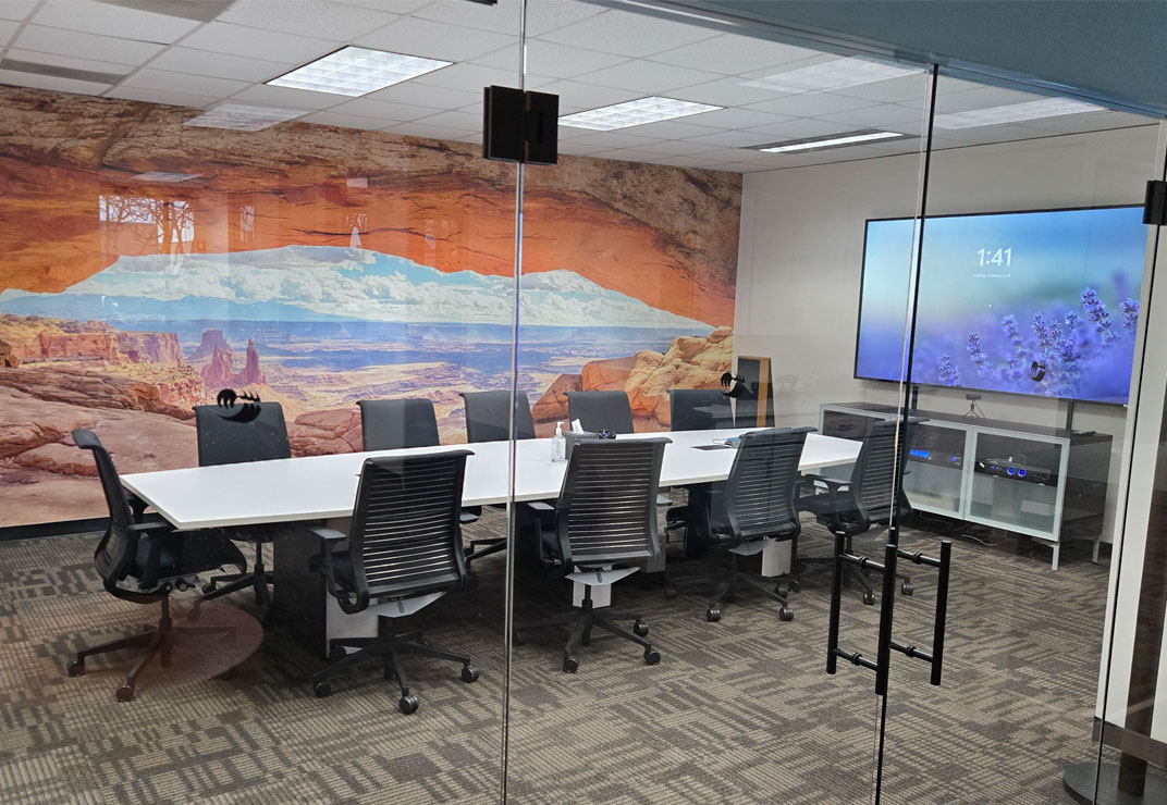 Prime flex space at Marina Blvd & Merced St. Open office, 3 private offices, glass-walled conference room, break area, and cubicles — plus potential to add roll-up door and warehouse storage.