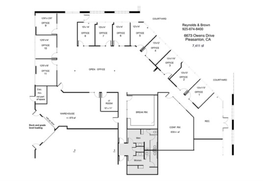 Flex space conveniently located in Pleasanton Park with restaurants and shopping in walking distance. Abundant glass line with 14 private offices, open bull pen area, large conference room, and break room. The warehouse (can be expanded) and has both grade level and dock high loading.